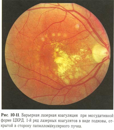 При отслойке пигментного эпителия или нейроэпителия, являющихся компонентами экссудативной формы ЦХРД, целесообразно нанесение коагулятов в виде дуги по краю отслойки, если она выходит за пределы бессосудистой зоны. В противном случае наносят 2 ряда коагулятов, отступя 1/2 ДД от края от-слойки. Коагуляты должны быть П-Ш степени, диаметр коагулята в 1-м ряду 50мкм,во 2-м 100мкм (рис. 10-11, 10-12).