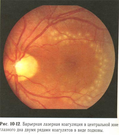 Барьерная лазерная коагуляция в центральной зоне глазного дна двумя рядами коагулятов в виде подковы. |