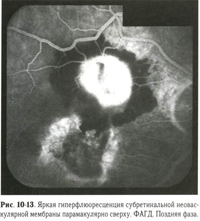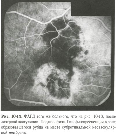 При коагуляции субретинальной неоваскулярной мембраны, расположенной в макулярной зоне, следует учитывать возможность снижения остроты зрения, о чём пациента нужно заранее предупредить. Коагуляцию начинают с нанесения коагулятов III степени по краю субретинальной неоваскулярной мембраны, затем переходят к сплошной черепицеобразной коагуляции мембраны. Наиболее щадящей для макулы считается коагуляция криптоновым лазером. Рекомендуется проведение контрольной ФАГД через 2-3 мес после лазерной коагуляции. Если полное рубцевание мембраны не достигнуто, то лазерную коагуляцию повторяют (рис. 10-13, 10-14).