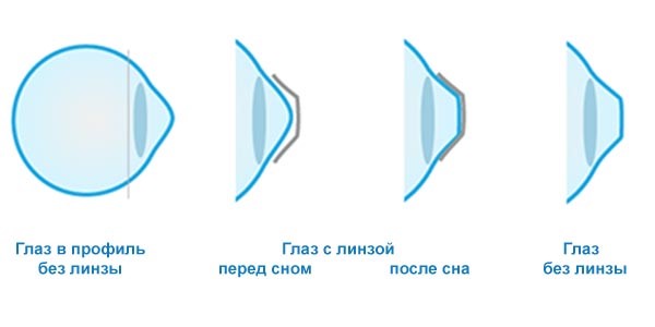 Ночные корректирующие линзы для зрения обладают двумя функциональными поверхностями. Наружная (оптическая) обеспечивает четкость зрения, как обычные дневные линзы. Внутренняя (терапевтическая) воздействует на эпителий роговицы, способствуя дозированному перемещению его клеток от центра к периферии. Во время сна происходит изменение формы роговицы на рассчитанную величину. Благодаря временным изменениям клеток роговицы пациент после снятия восстанавливающих линз получает отличное зрение на весь день. Эффект коррекции временный, клетки эпителия постоянно обновляются, и возвращаются к своей исходной форме в течение 24 до 48 часов. Регулярное ночное использование линз позволяет поддерживать результат.